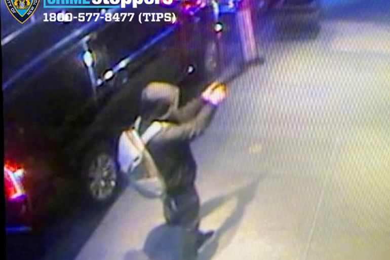 New York Police Department releases CCTV stills showing a man wearing a hooded jacket with his face clearly visible.